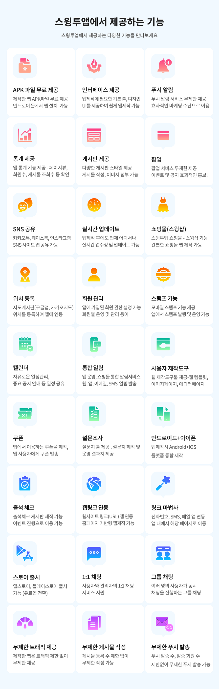 스윙투앱에서는 앱제작 및 앱운영에 필요한 다양한 기능을 모두 무료로 제공하고 있습니다.