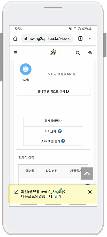 앱제작이 완료되면 앱운영-버전관리-앱제작이력 페이지에서 제작한 앱을 다운 받을 수 있습니다.