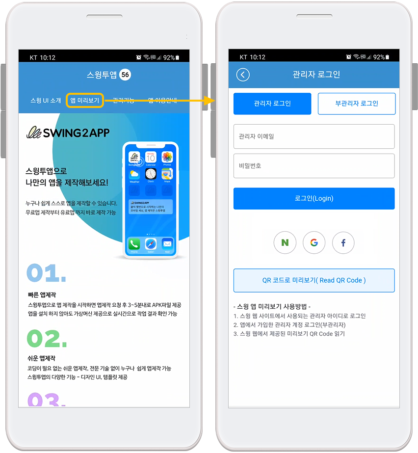 *핸드폰으로 미리보기: 스윙투앱 공식앱을 다운 받은 뒤 →앱 미리보기 메뉴 → 스윙계정으로 로그인하거나 or 팝업창에 보여지는 QR코드를 스캔하면 핸드폰에서도 앱을 미리보기로 확인할 수 있어요!(다운이 아닌 미리보기입니다.)