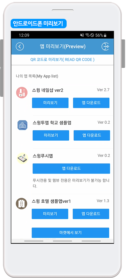 스윙투앱 공식앱에서 제공하는 앱미리보기 메뉴로 제작한 앱을 직접 다운 받거나 미리보기로 확인할 수 있구요.