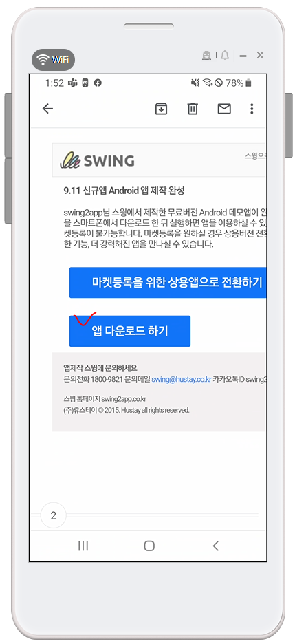앱제작이 완료되면 스윙투앱에서 사용자 메일로 앱 제작완료, 앱 다운로드 메일을 보내드려요.
