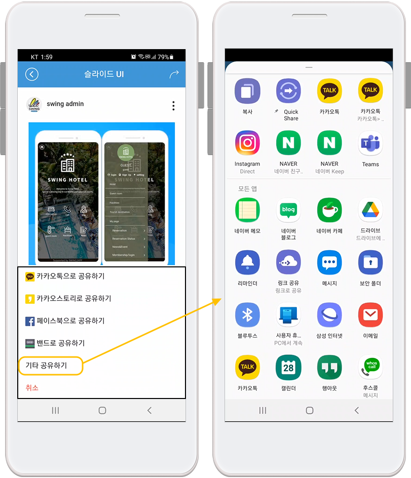 [기타 공유하기]를 선택하면 핸드폰 내에 설치된 다양한 어플 목록이 뜨구요.