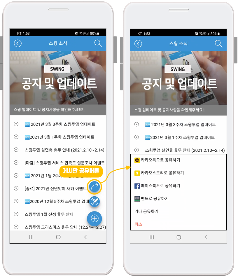 공유 기능은 게시판 공유 뿐만 아니라 앱 공유, 게시물 공유까지 가능합니다.