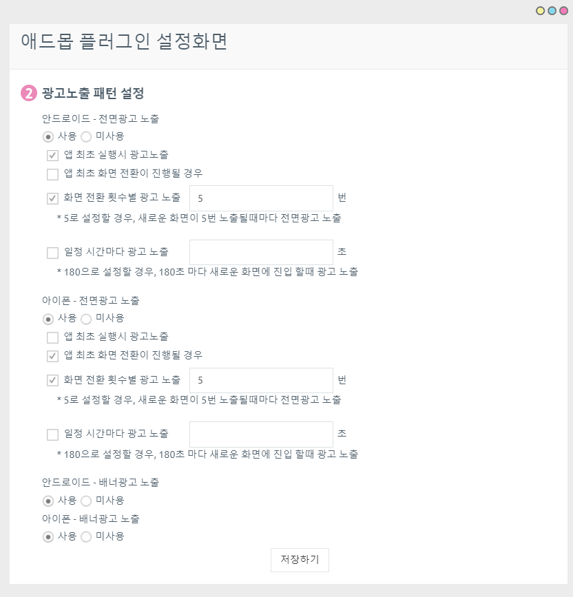 예시)’5’로 설정시 화면이 5번 전환 될 때 전면광고가 노출됩니다.