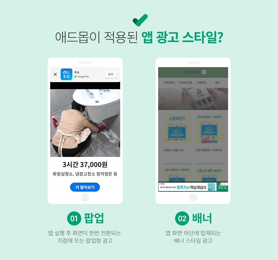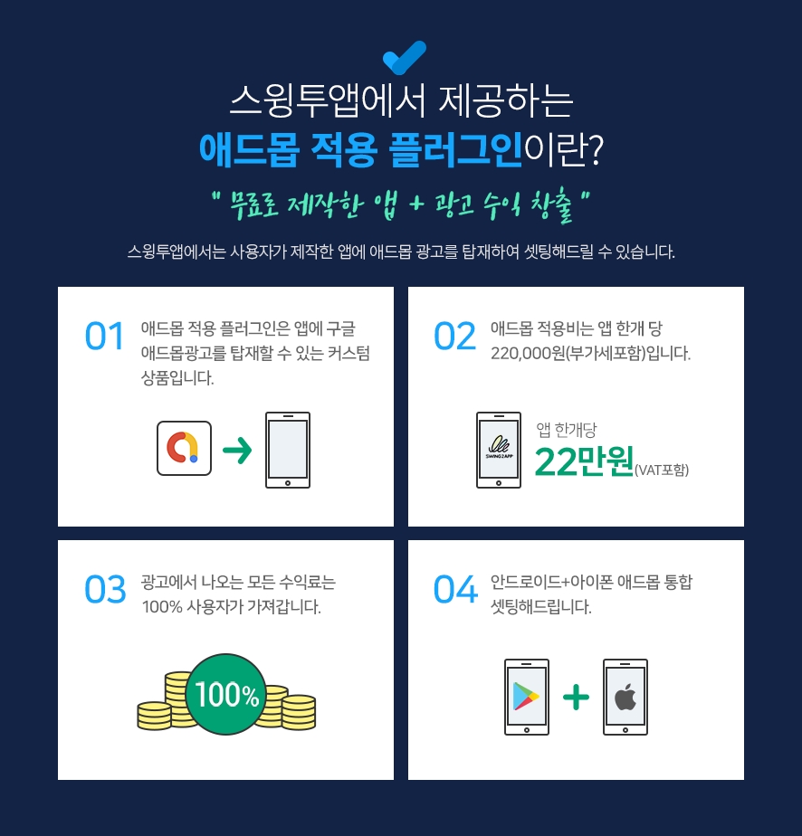 애드몹 적용 플러그인 상품을 구매하시면, 스윙투앱에서 제작한 앱에 애드몹 광고를 셋팅할 수 있습니다.