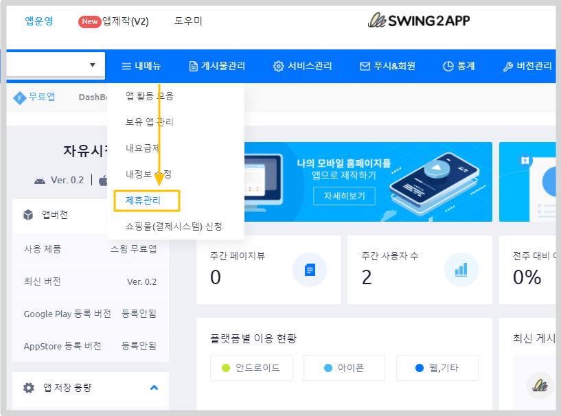 스윙 앱운영 페이지 → 내메뉴 → 제휴관리 메뉴로 이동해주세요.