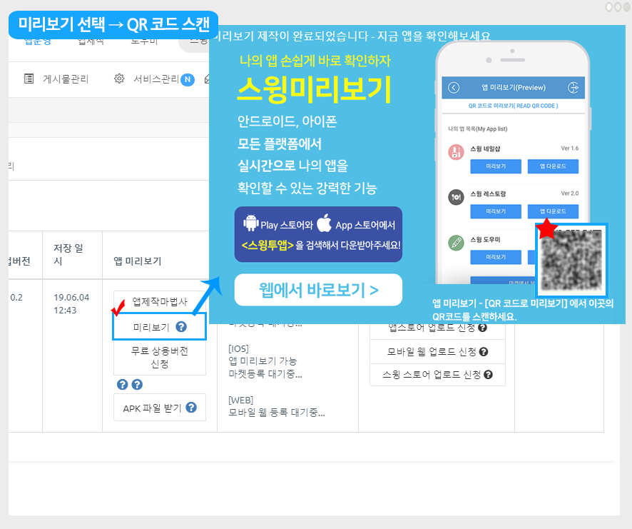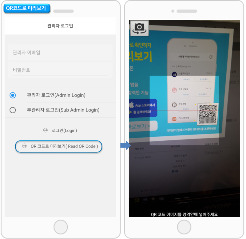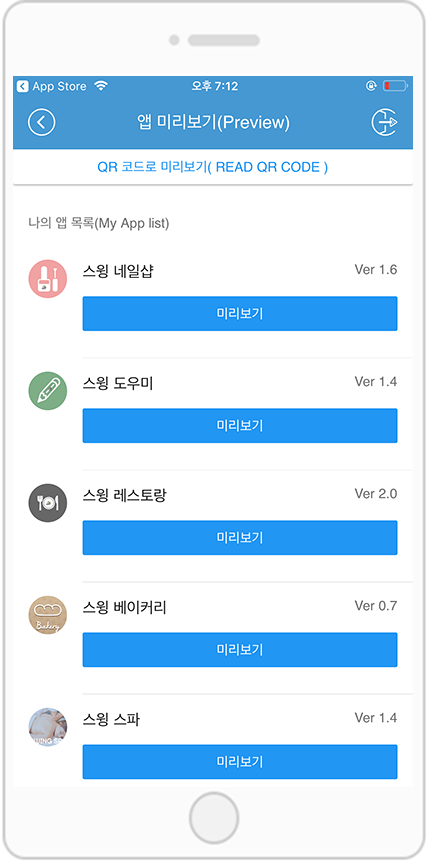 해당 메뉴는 관리자로 로그인하지 않아도! 앱마다 제공되는 QR코드를 스캔하여 핸드폰에서 앱을 미리볼 수 있습니다.