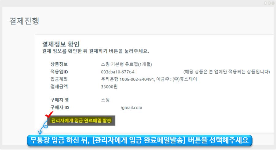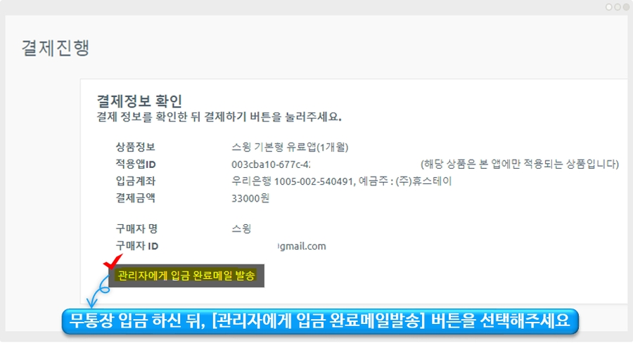 무통장 입금이 완료된 후 [관리자에게 입금 완료 메일 발송] 버튼을 선택해주셔야 합니다.