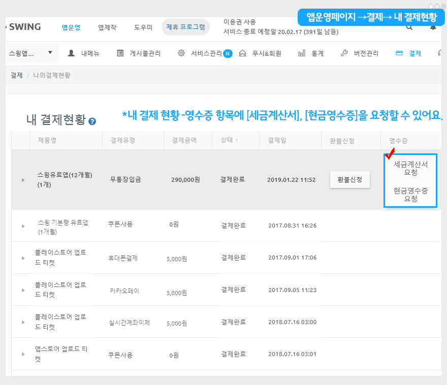 입금 완료 후, 앱운영 페이지 → 결제/이용권 구매→ 내결제 현황으로 이동하면 영수증 항목에서 [세금계산서] or [현금영수증]을 요청할 수 있습니다.