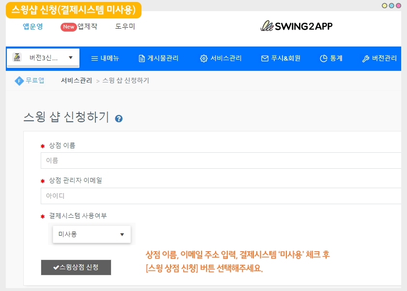 스윙 쇼핑몰은 앱운영페이지 → 내메뉴 → ‘쇼핑몰(결제시스템)신청’에서 신청하실 수 있습니다.