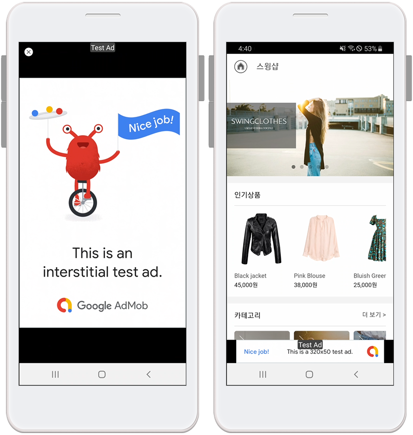 테스트 광고 아이디로 앱에 셋팅을 잘 했는지, 앱 광고가 어떻게 뜨는지 확인할 수 있어요.
