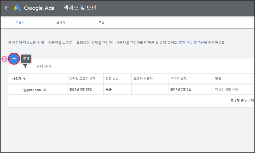 2)Google Ads 사이트 상단의 도구 및 설정 선택 → 엑세스 및 보안 메뉴 선택