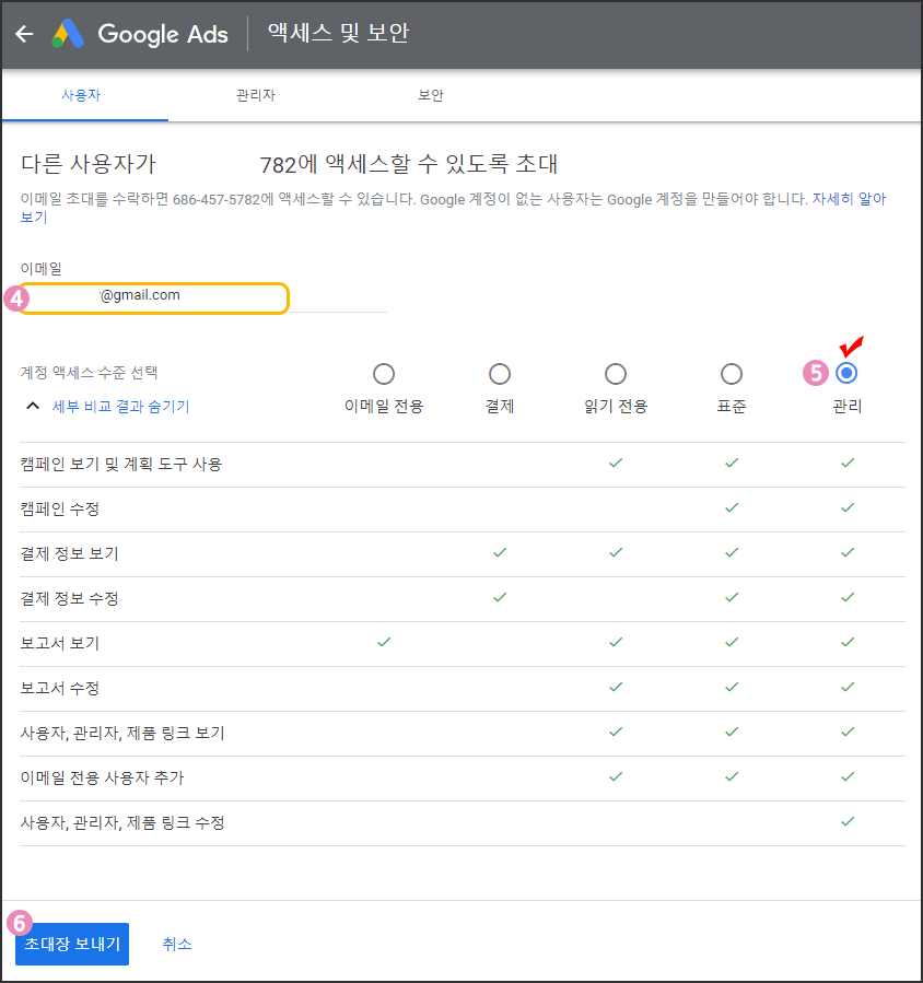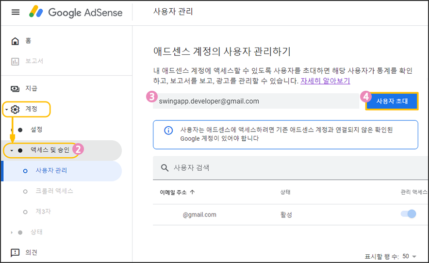 애드몹 계정에 사용자를 초대하여, 액세스 권한을 부여하는 방법