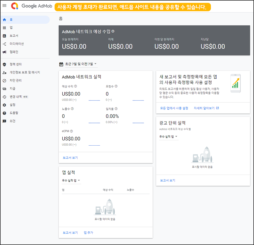애드몹 관리 페이지 이슈사항을 확인하기 위해서 사용자 초대가 필요할 수 있습니다.