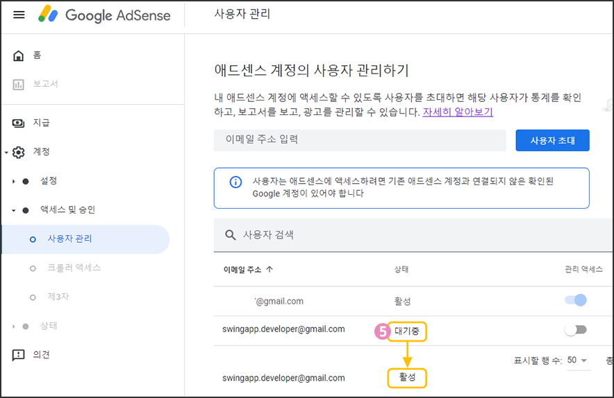 구글 애즈에서 사용자 초대가 완료되었으면, 다음은 애드센스로 접속하여 사용자 초대를 진행해주세요.