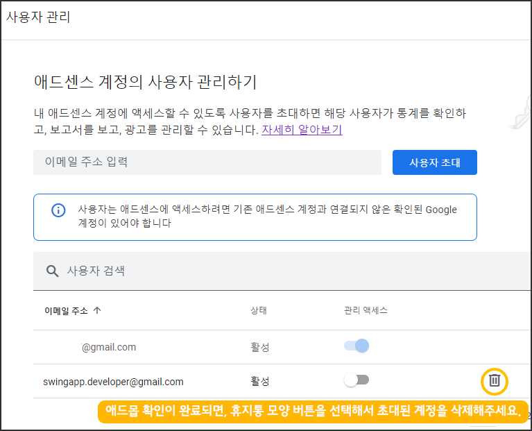애드몹 확인이 공식적으로 완료되었다는 안내를 받으시면 초대된 계정 권한을 삭제해주시기 바랍니다.