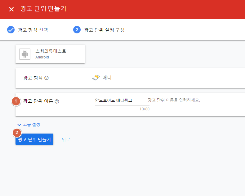 1)광고 단위 이름 입력: “안드로이드 배너 광고” 로 입력했구요. 꼭 똑같이 입력하지 않아도 괜찮습니다.