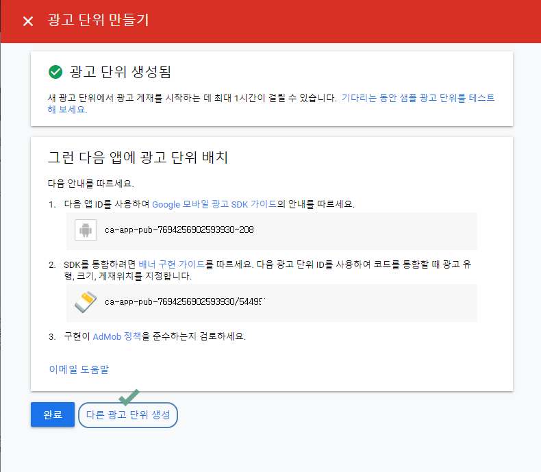 + 그리고 해당 앱에 광고 단위를 더 만들어야 할 경우 [광고 단위 추가] 버튼을 눌러서 다른 광고 아이디를 추가할 수 있어요.