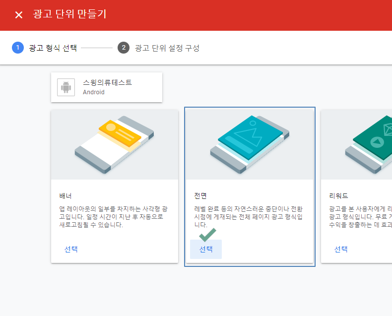 안드로이드 배너광고 단위가 생성되었구요. 이어서 전면 광고 아이디도 만들어볼게요.
