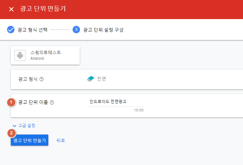 1)광고 단위 이름 입력: “안드로이드 전면 광고” 로 입력했습니다.