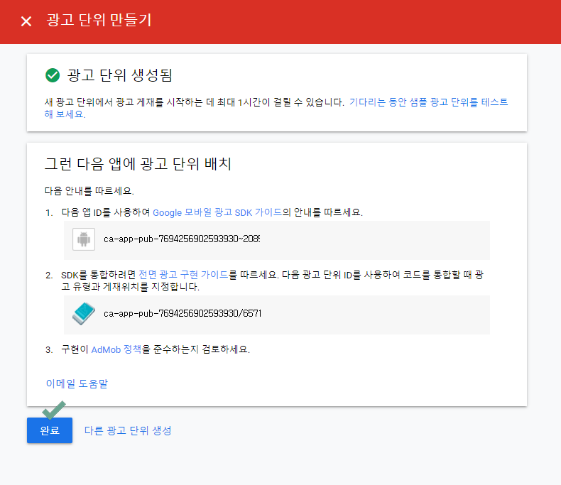 따라서 광고 단위는 배너와 전면 각각 만들어주시면 됩니다.