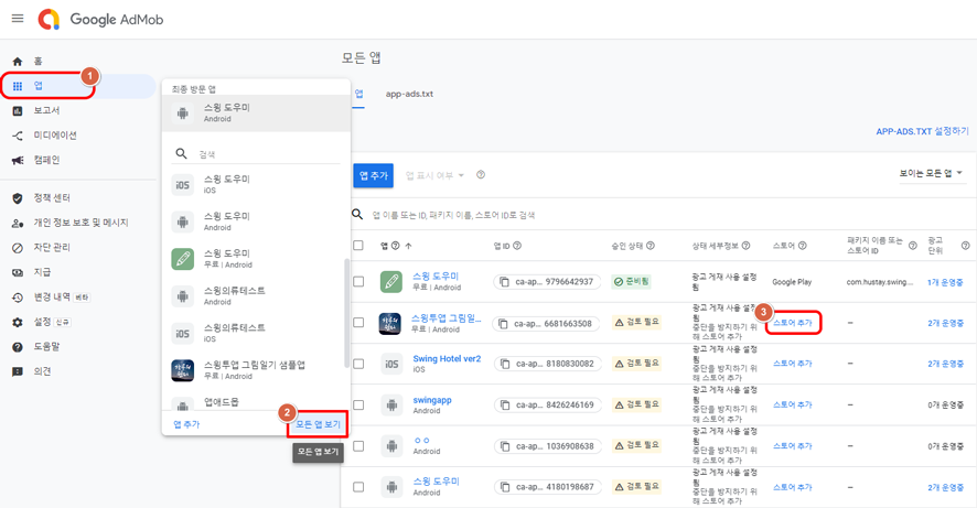 광고 셋팅을 하기 위해서는 앱 아이디도 함께 확인해야 합니다.