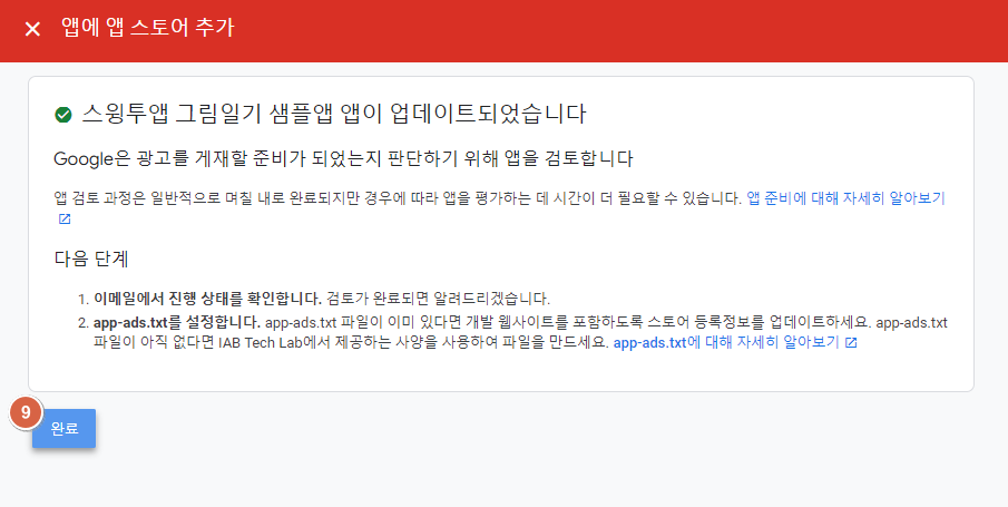 따라서 앱을 스토어에 출시 한 뒤 다시 AdMob 사이트로 돌아와서 아래의 과정을 완료해야 합니다.