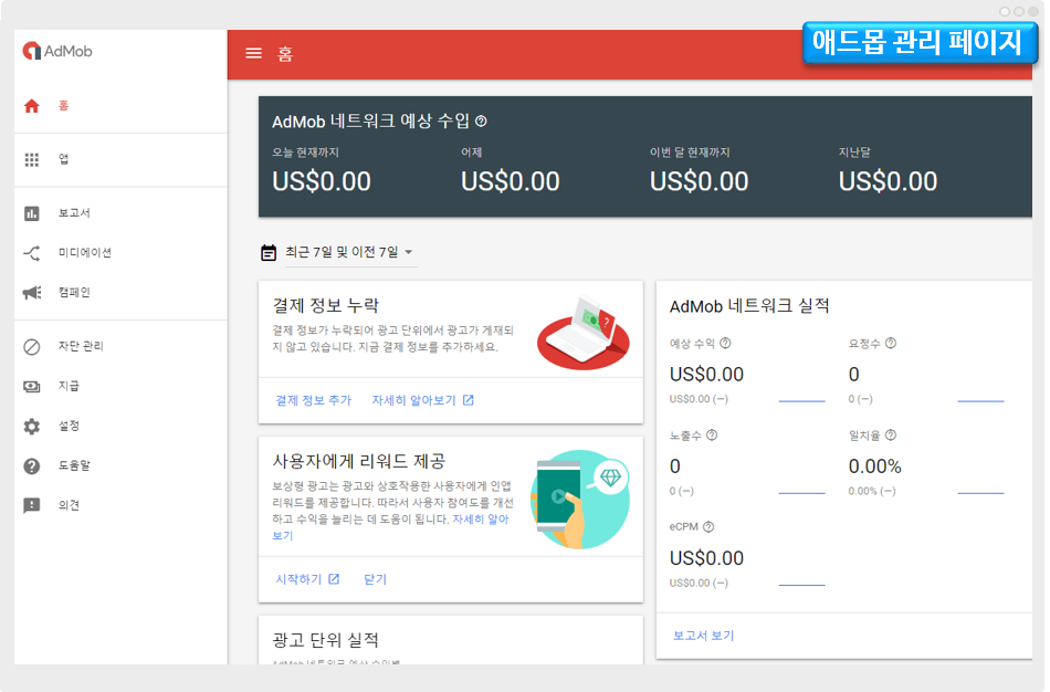 그럼 위의 이미지처럼 애드몹 관리 페이지가 뜹니다.