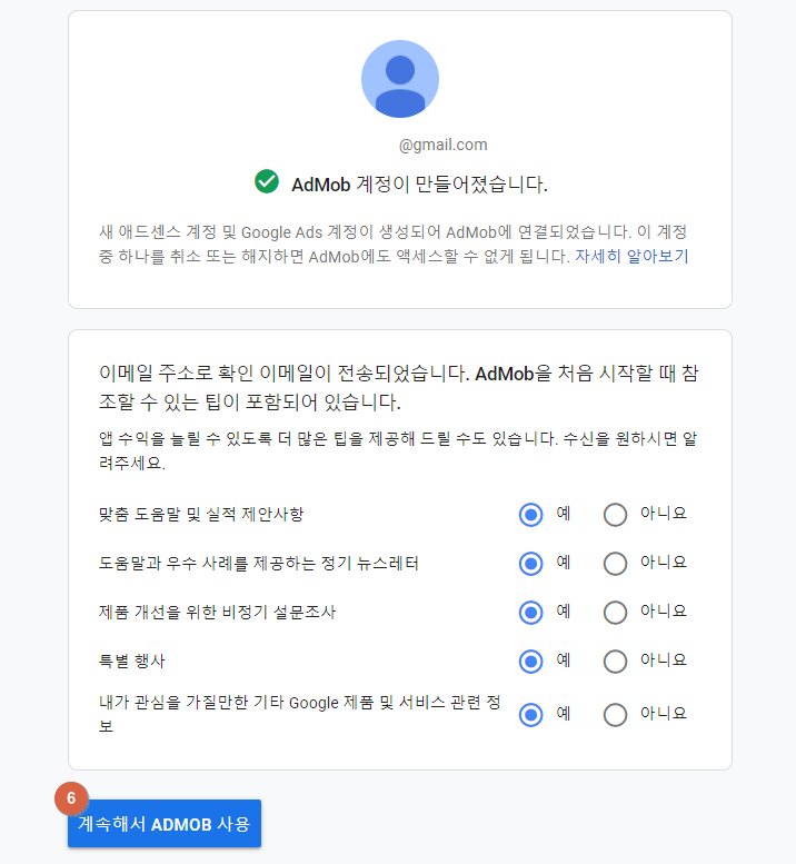 6) 기본정보 입력 후 해당 항목들에 체크한 뒤 [계속해서 ADMOB 사용] 버튼을 선택합니다.
