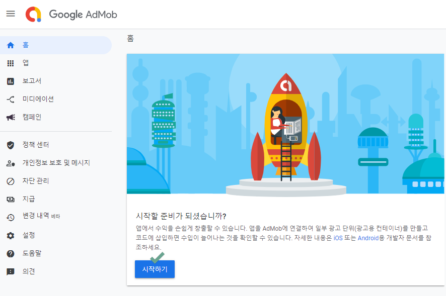해당 페이지에서 [시작하기] 버튼을 선택해서 앱에 광고 단위 아이디를 만들어볼게요!!