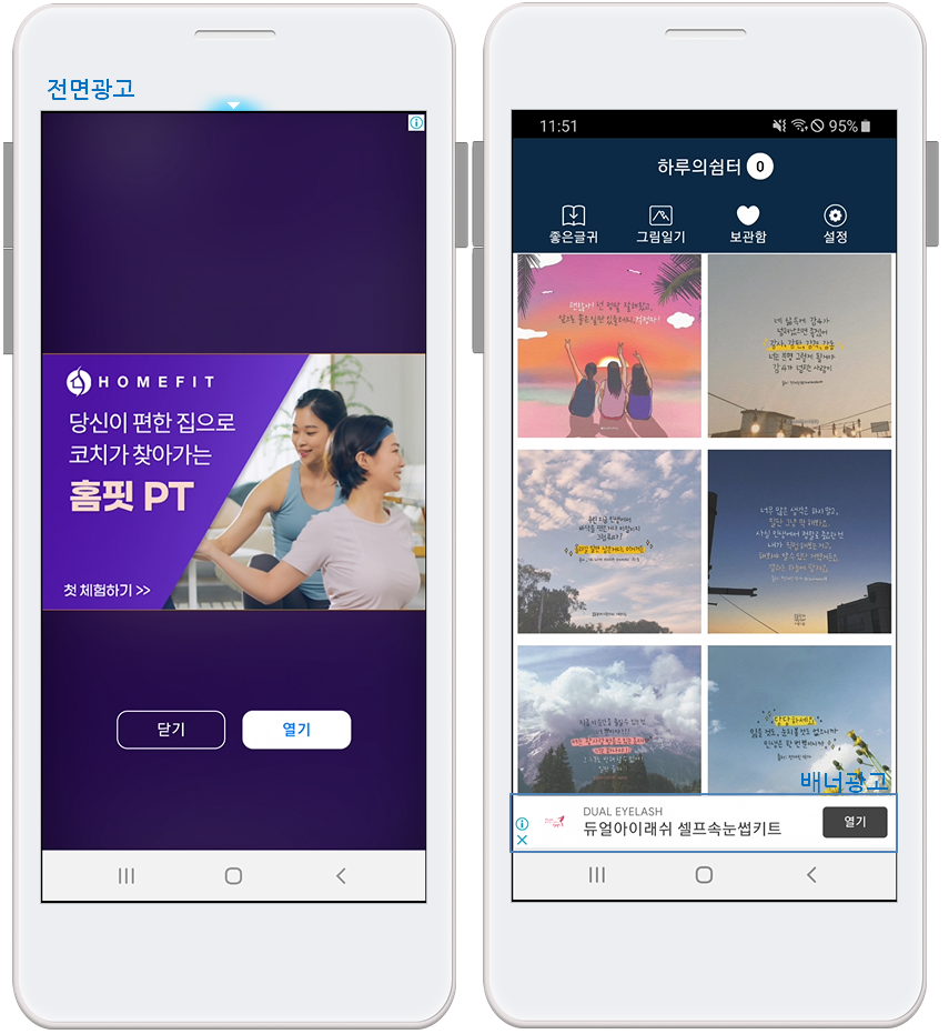 애드몹 광고는 배너, 전면 2가지로 적용할 수 있습니다.