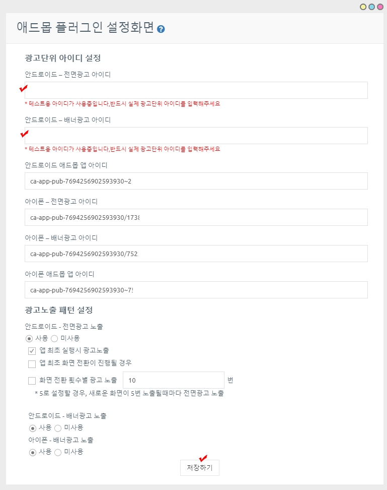 따라서 광고 단위 아이디, 앱 아이디가 맞게 잘 입력되었는지 한번 더 확인해주세요!