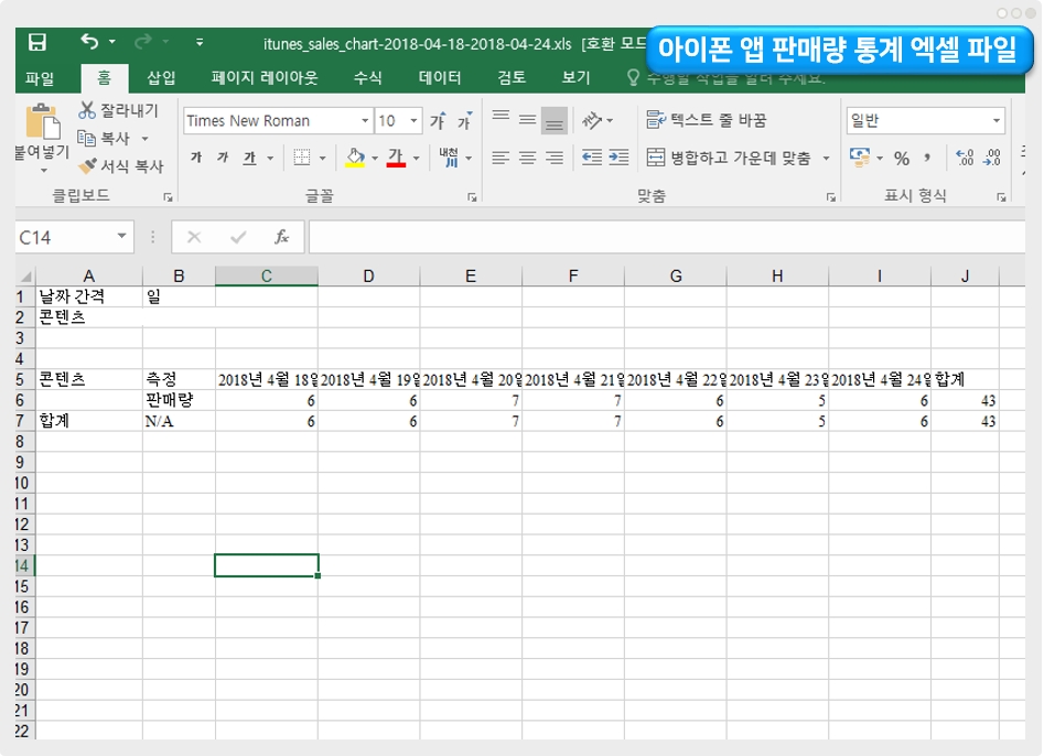 엑셀파일을 열면 이렇게 해당 기간동안의 앱 설치수(판매량)을 확인할 수 있습니다.
