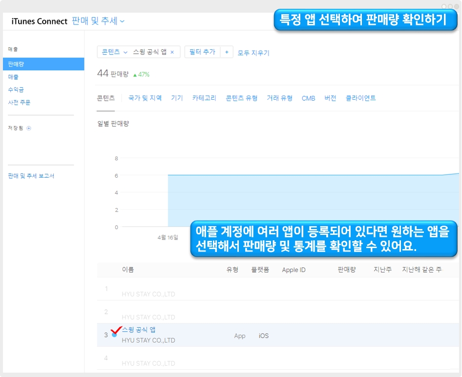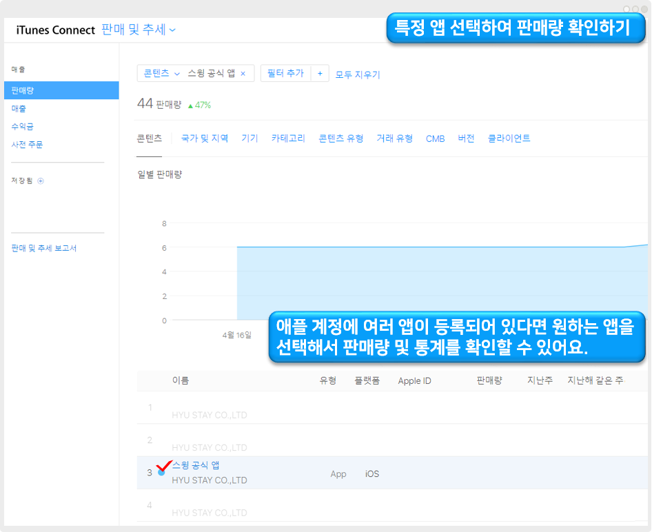 이렇게 여러 앱 중에서 특정 앱의 판매량을 확인하고 싶다면, 목록에서 해당 앱을 선택하시면 되구요.