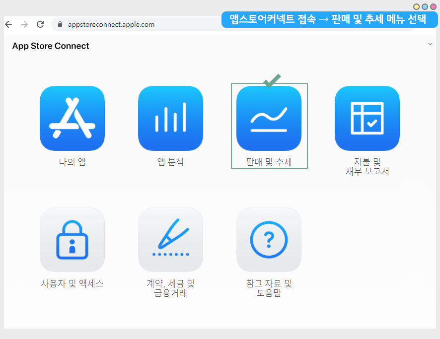 1. 사용자분의 애플 개발자계정이 있으실 경우만, 앱스토어 커넥트에 접속하여 앱 판매량 통계를 확인할 수 있어요.