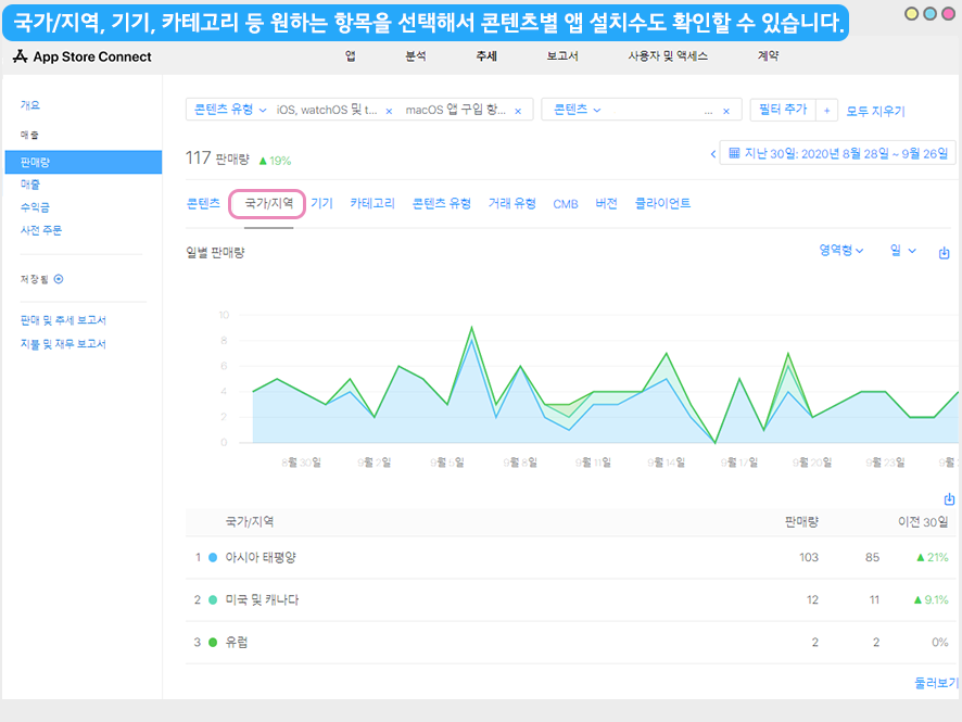 판매량 페이지가 앱 설치수를 상세한 지표로 확인할 수 있습니다.
