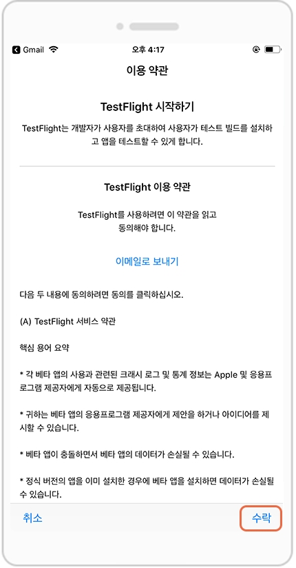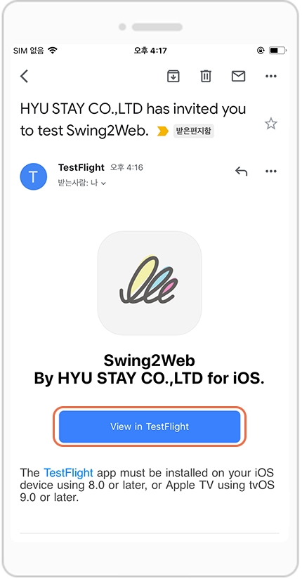 메일에서 [View in TestFlight] 버튼을 선택해주세요.