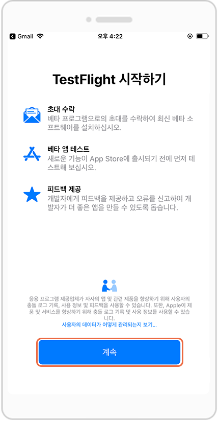 TestFlight 시작하기에서 [계속] 버튼을 눌러주세요.
