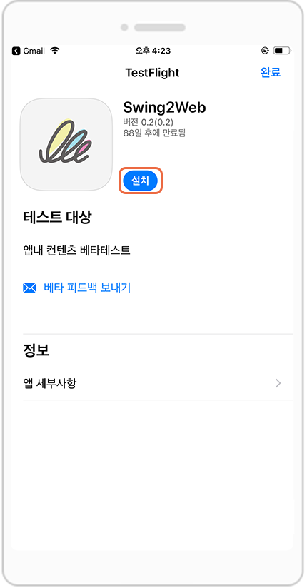 *이용약관은 TestFlight를 처음 이용하는 분들만 뜨기 때문에 한번이라도 이용을 한 사용자들은 위의 페이지가 뜨지 않고 바로 앱 설치화면으로 이동합니다!