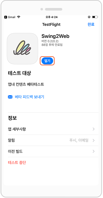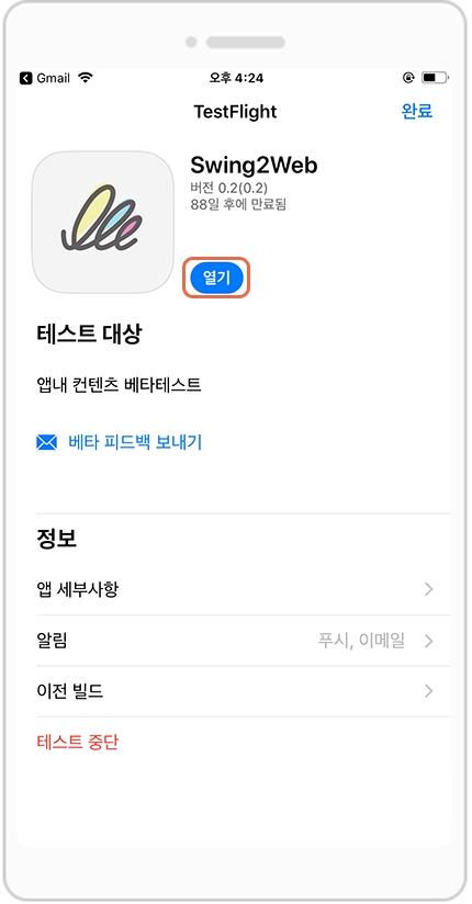 2)TestFlight 이용기간은 스윙투앱에서 따로 체크해드리거나 남은 이용일에 대해 안내드리지 않습니다.