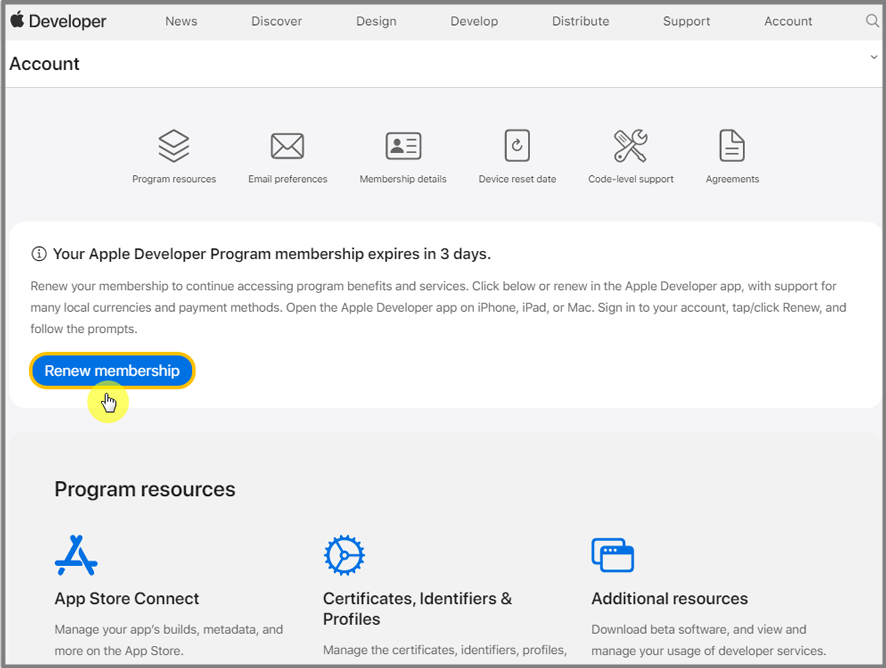 2. Apple Developer 사이트 – Renew membership 선택
