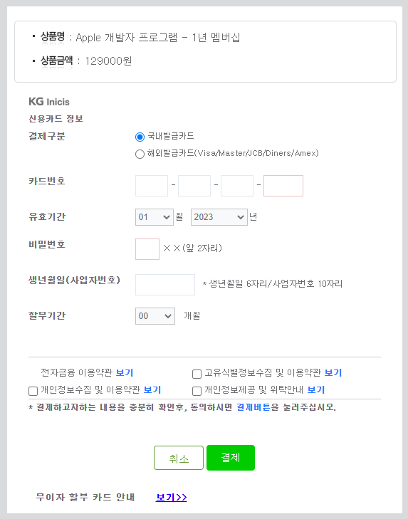 결제에 필요한 정보는 모두 기재를 해주셔야 합니다.