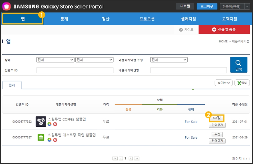 애플리케이션이 ‘For Sale’ 또는 ‘Suspended’상태일 때만 [애플리케이션 수정] 버튼을 사용할 수 있으며,