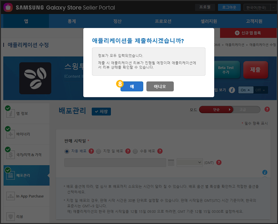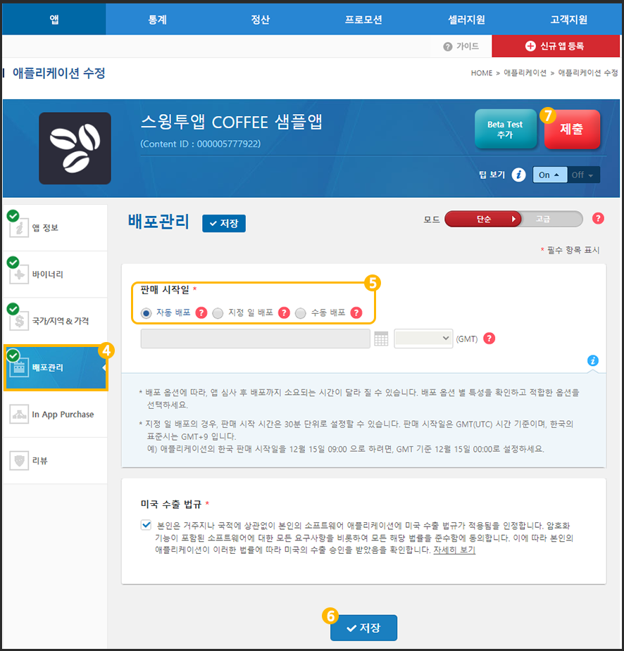 5)판매 시작일 선택 *업데이트 심사 후 바로 출시를 원하면 자동배포를 선택해주세요.