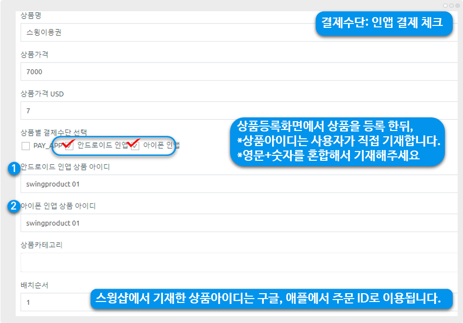 *제품 ID는 먼저 스윙홈페이지- 스윙샵 상품관리에서 제품 아이디를 입력해야 합니다.