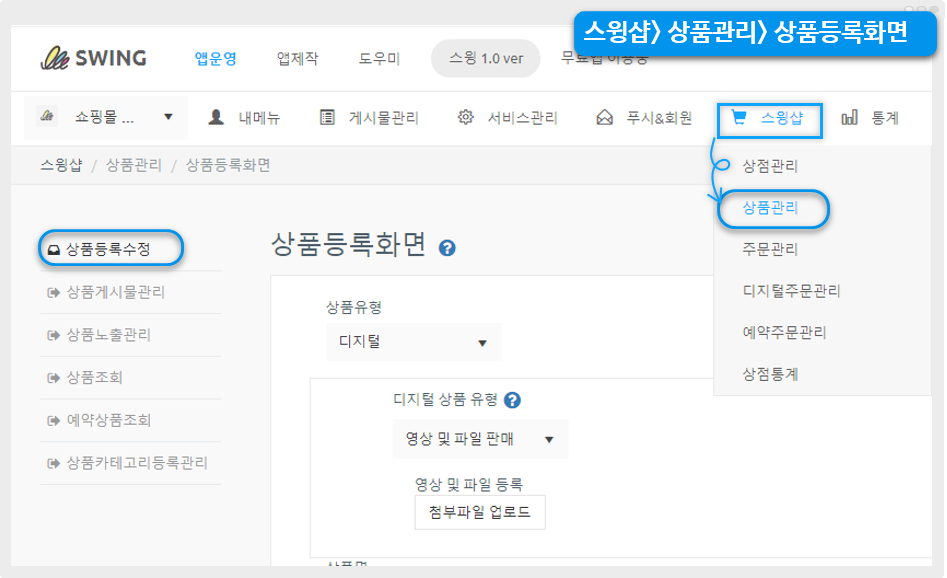 스윙 홈페이지 접속 후, 스윙샵 →상품관리 → 상품등록화면으로 이동합니다.