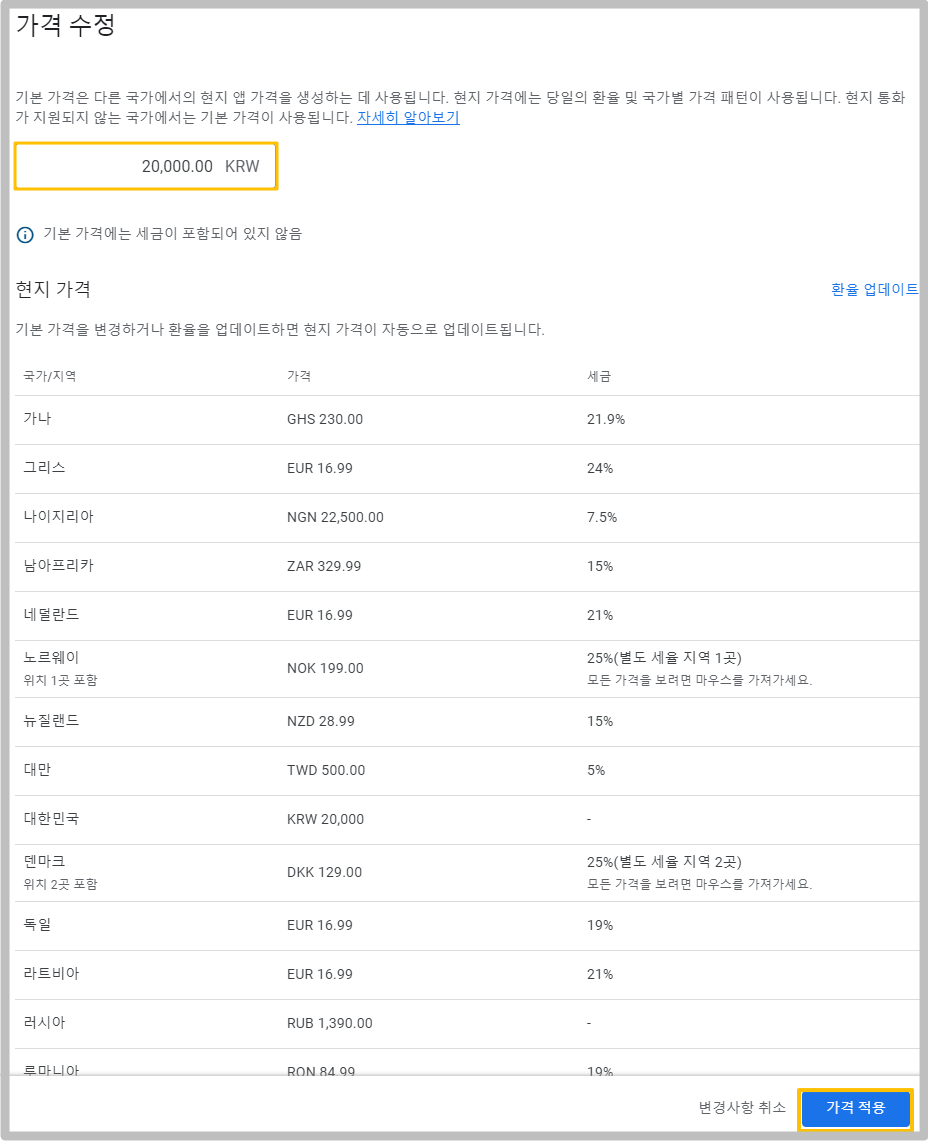 한국 원화 기본 셋팅되며, 원하는 가격을 입력한 뒤 \[가격 적용] 버튼을 선택합니다.&#x20;