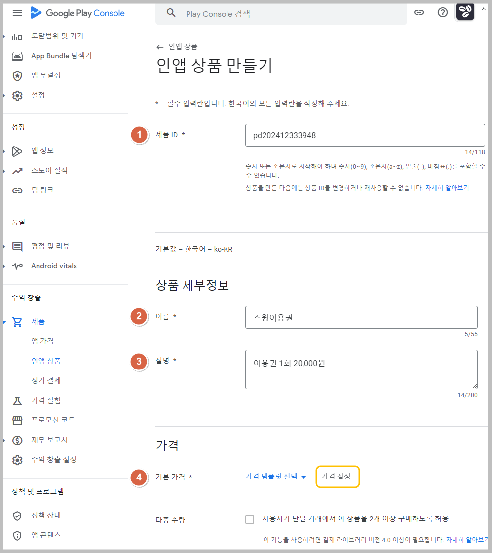 ## **STEP2. 인앱 상품 만들기(정보 입력)**
