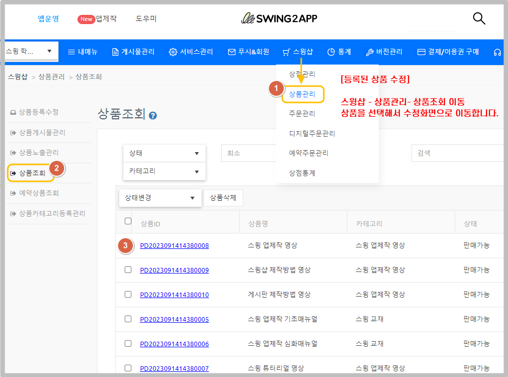 [**스윙샵→상품관리→ 상품조회** ](https://www.swing2app.co.kr/view/store_product_list)화면 이동