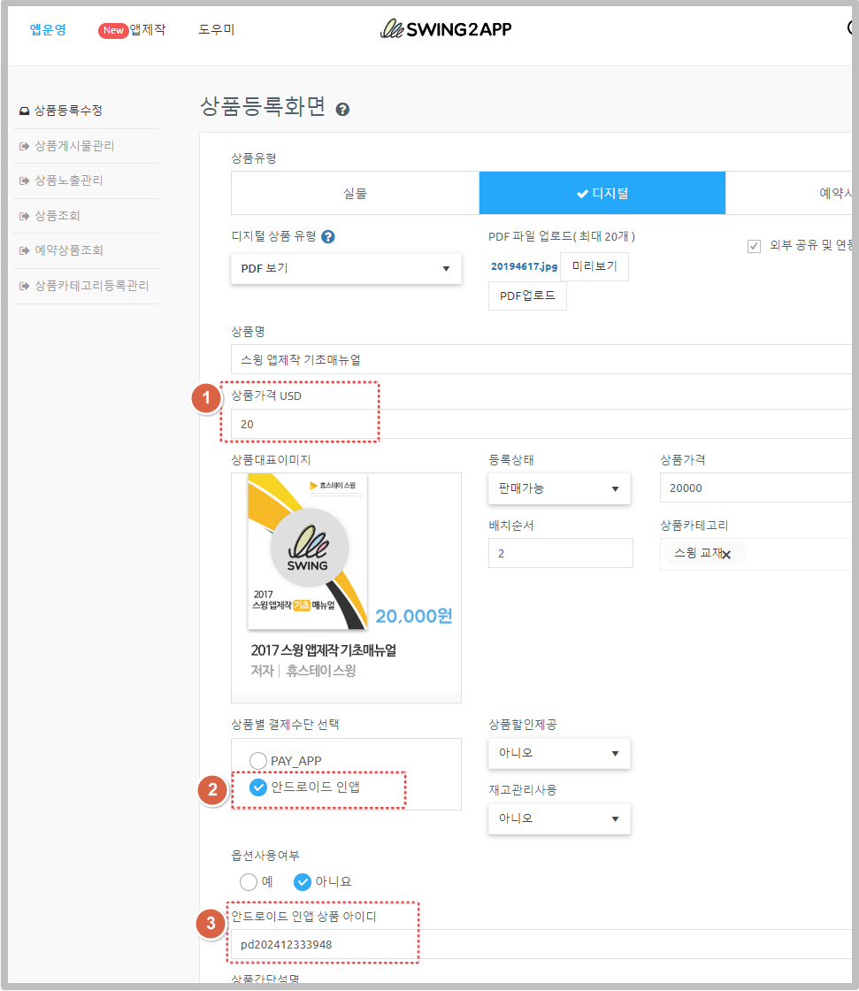 <mark style="color:red;">**\*제품 ID는 먼저 스윙홈페이지 – 스윙샵 상품관리에서 제품 아이디를 입력해야 합니다.**</mark>&#x20;
